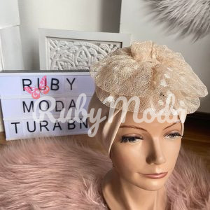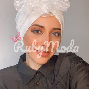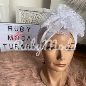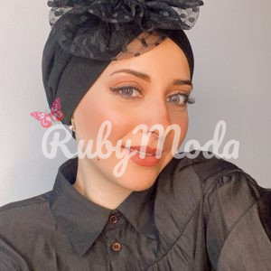 Turban en tissu de crêpe avec une grande fleur en maille (Blanc ou noir).